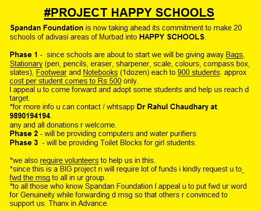 Recently Spandan Foundation gave Bags and Stationary to 13 schools (840 students) in adivasi areas of Murbad. Word spread and now 14 more such schools (890 students) have approached us. It's approx Rs 400 per kit.